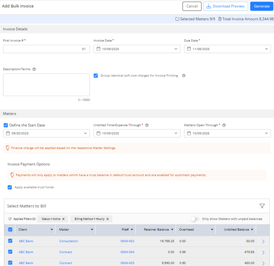 From Billing, you can generate multiple invoices across multiple matters at once.