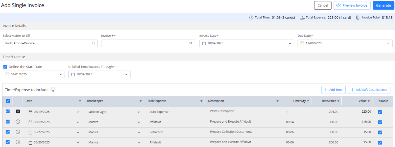 From Matters, you can generate an invoice based on one or more time and expense cards for a single matter.